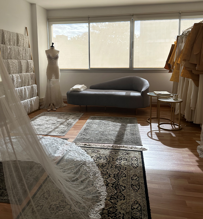 Nuestro atelier en Colegiales es el corazón de Novias Modernas. Aquí confeccionamos todos los vestidos in-house, con maquinaria especializada en alta costura y un equipo calificado que trabaja de forma artesanal bajo la dirección y supervisión de nuestra diseñadora.