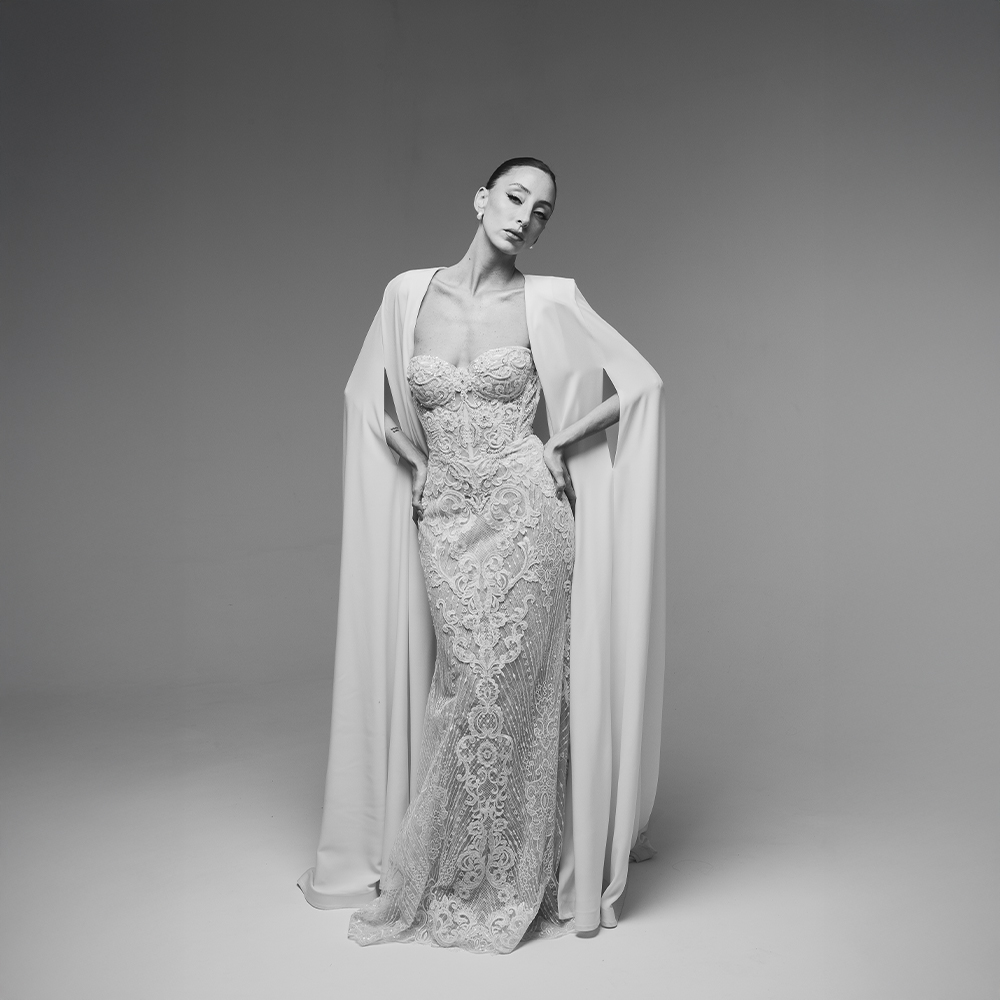 Cada pieza permanece siempre en el atelier, cuidándola en cada etapa del proceso.Todos los vestidos se realizan de manera 100% artesanal, con materiales nobles, encajes bordados a mano y técnicas de pedrería, que hacen de cada pieza una verdadera obra de arte.